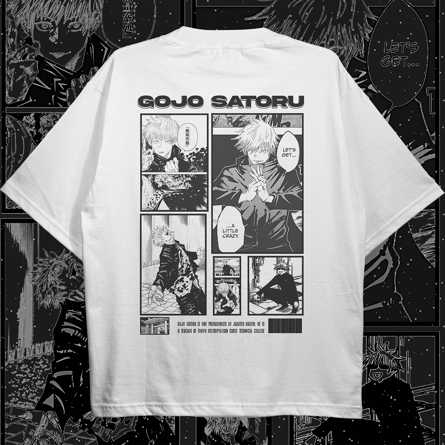 - Back Graphic: A massive, multi-panel manga collage. It features Gojo’s most iconic moments—from the cold intensity of Infinite Void to the legendary “Let’s get a little crazy” sequence. The high-detail ink captures every line of the original manga art.