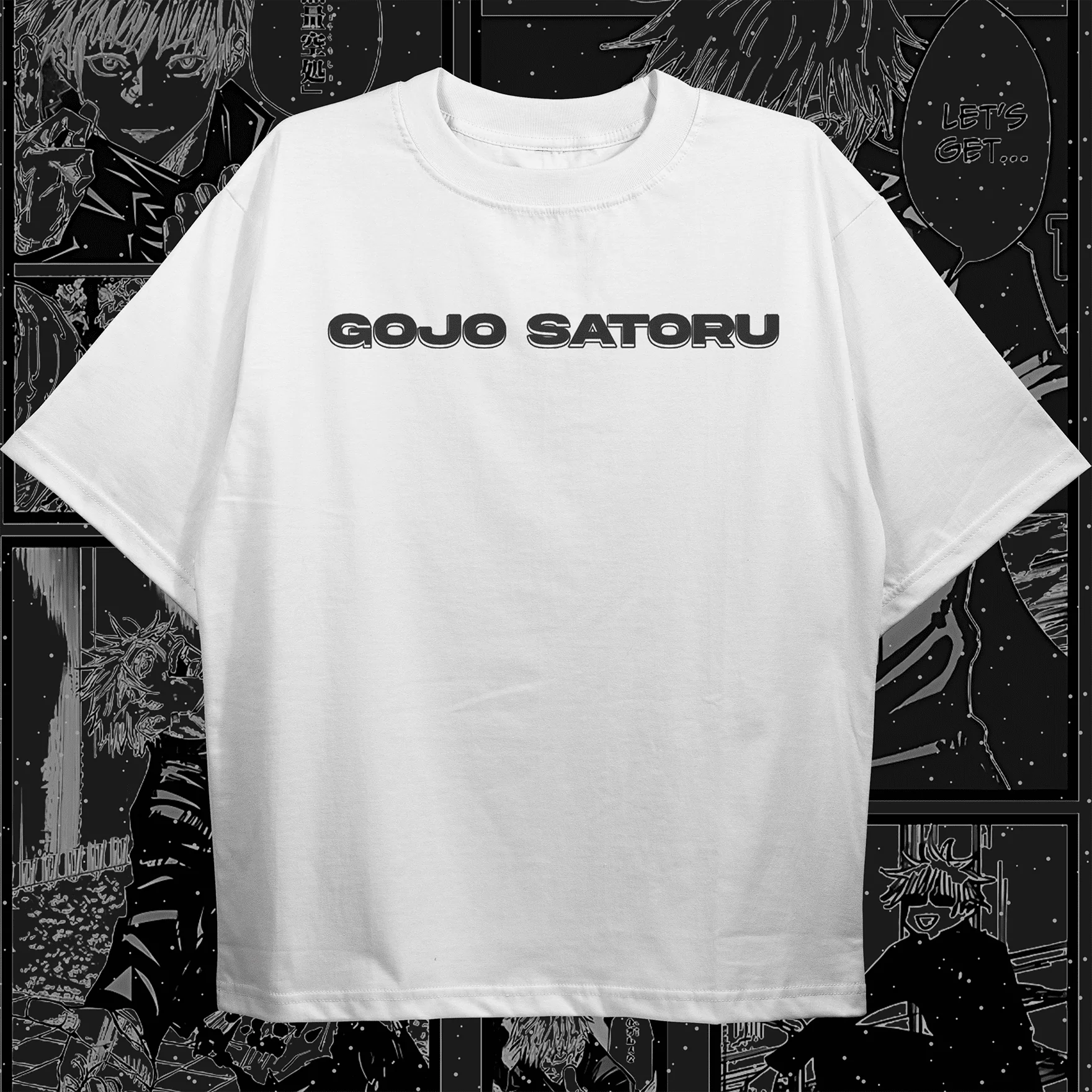 - Front Graphic: A clean, bold “GOJO SATORU” typographic print across the chest in a stylized modern font, signaling the presence of the Limitless user with minimalist precision.