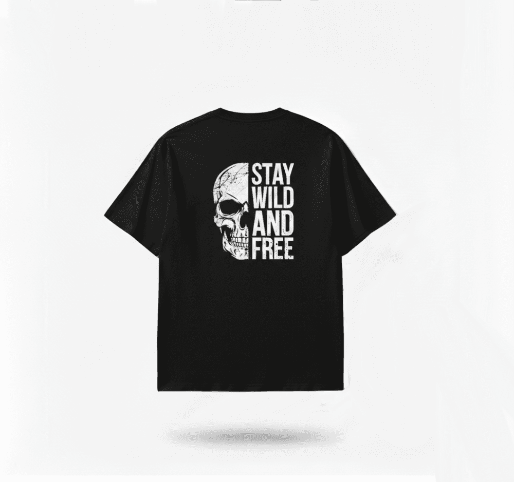 ✔ Bold Skull Graphic Print – Striking “Stay Wild and Free” design that stands out effortlessly