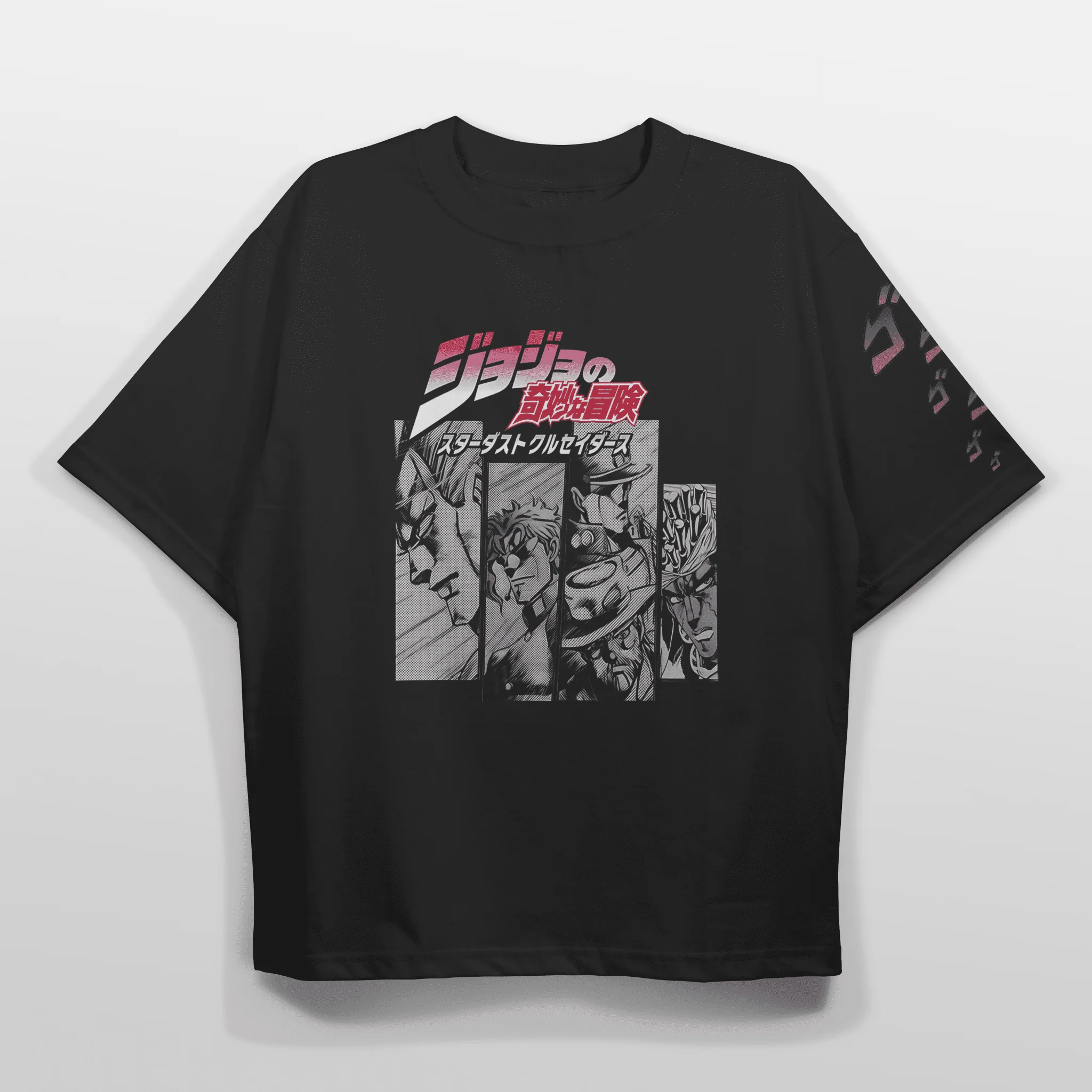 • Front Graphic: A cinematic, monochromatic panel featuring the core crusaders—Jotaro Kujo, Noriaki Kakyoin, Joseph Joestar, and Jean Pierre Polnareff. Topped with the classic pink-to-red gradient JoJo logo and “Stardust Crusaders” in sharp Japanese katakana.